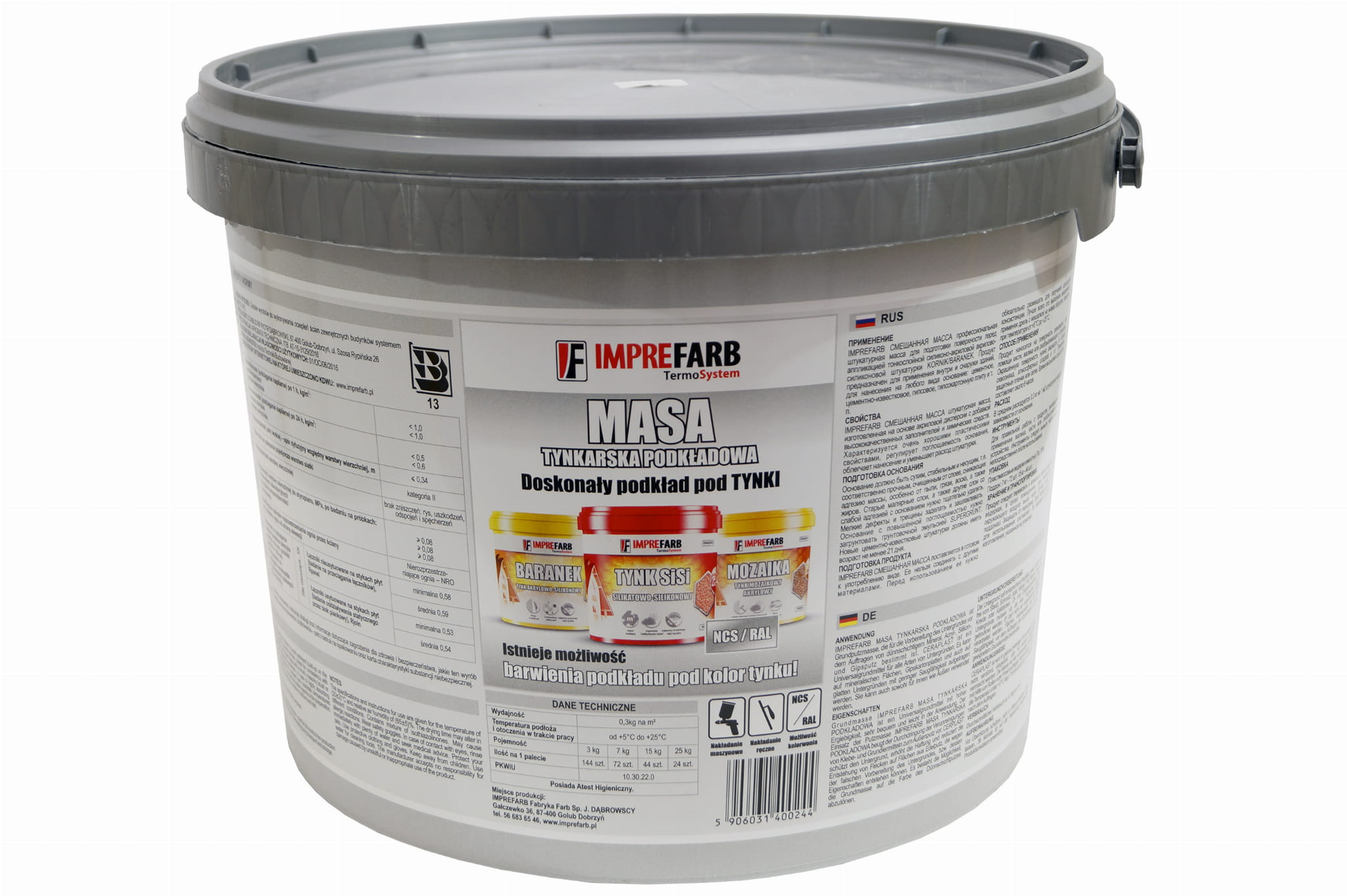Masa tynkarska podkładowa marki IMPREFARB służy do przygotowania powierzchni przed nakładaniem tynków akrylowo silikonowych, silikonowych, silikonowo silikatowych, mineralnych, oraz mozaikowych. Zwiększa przyczepność tynku, jest elastyczna i trwała.