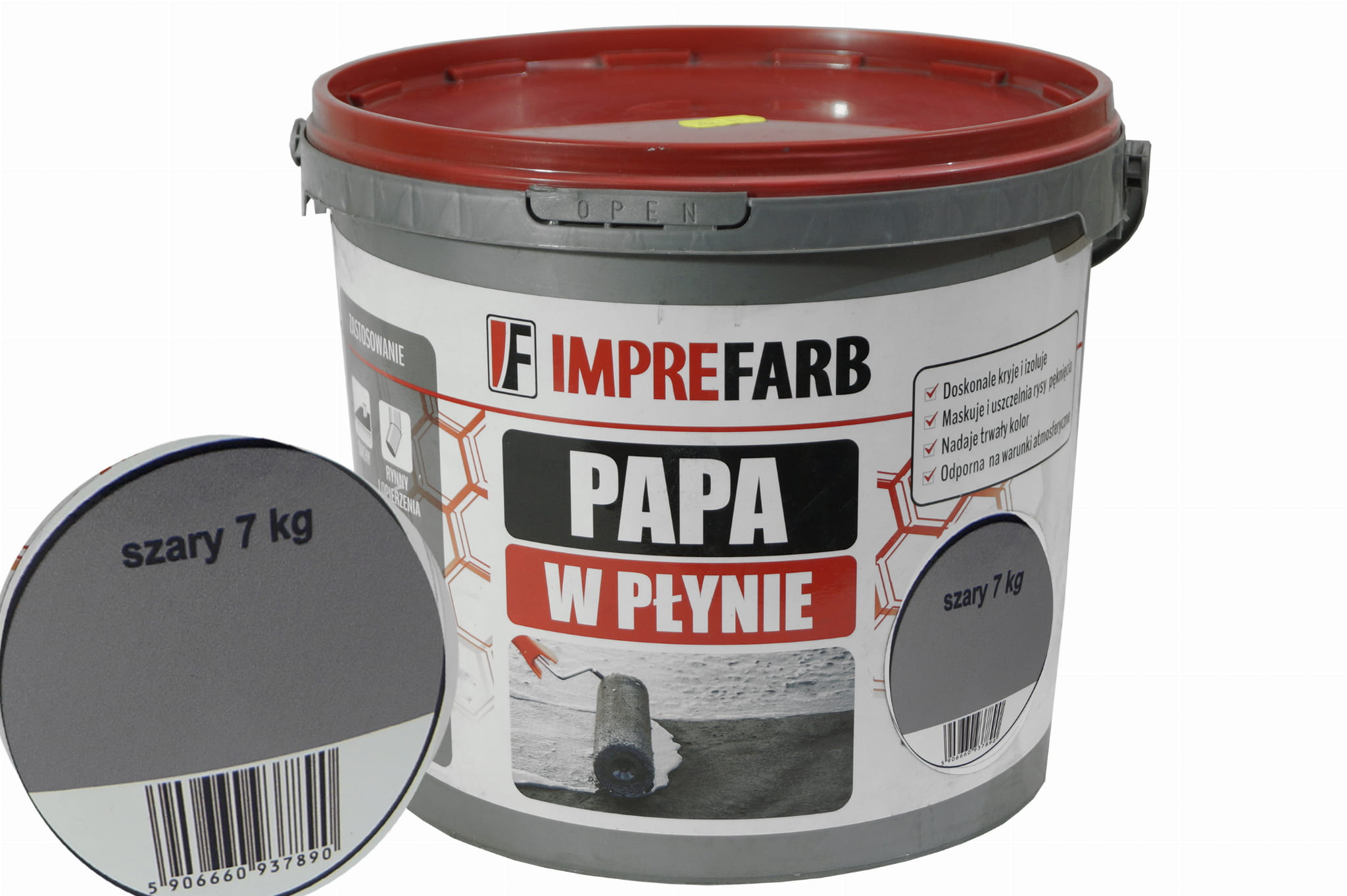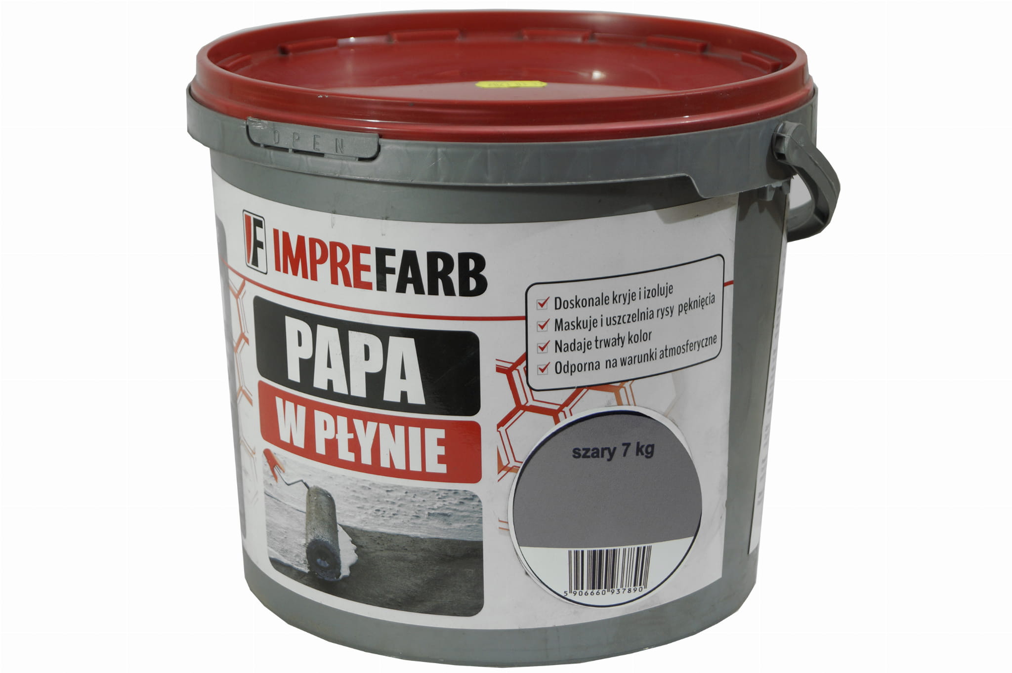 Papa w płynie marki Imprefarb posiada kolor SZARY oraz opakowanie 7kg, co sprawia, że jedno opakowanie wystarcza na 8,75 - 17,5m2 powierzchni. Papa w płynie jest gotową masą i nie wymaga rozcieńczania!