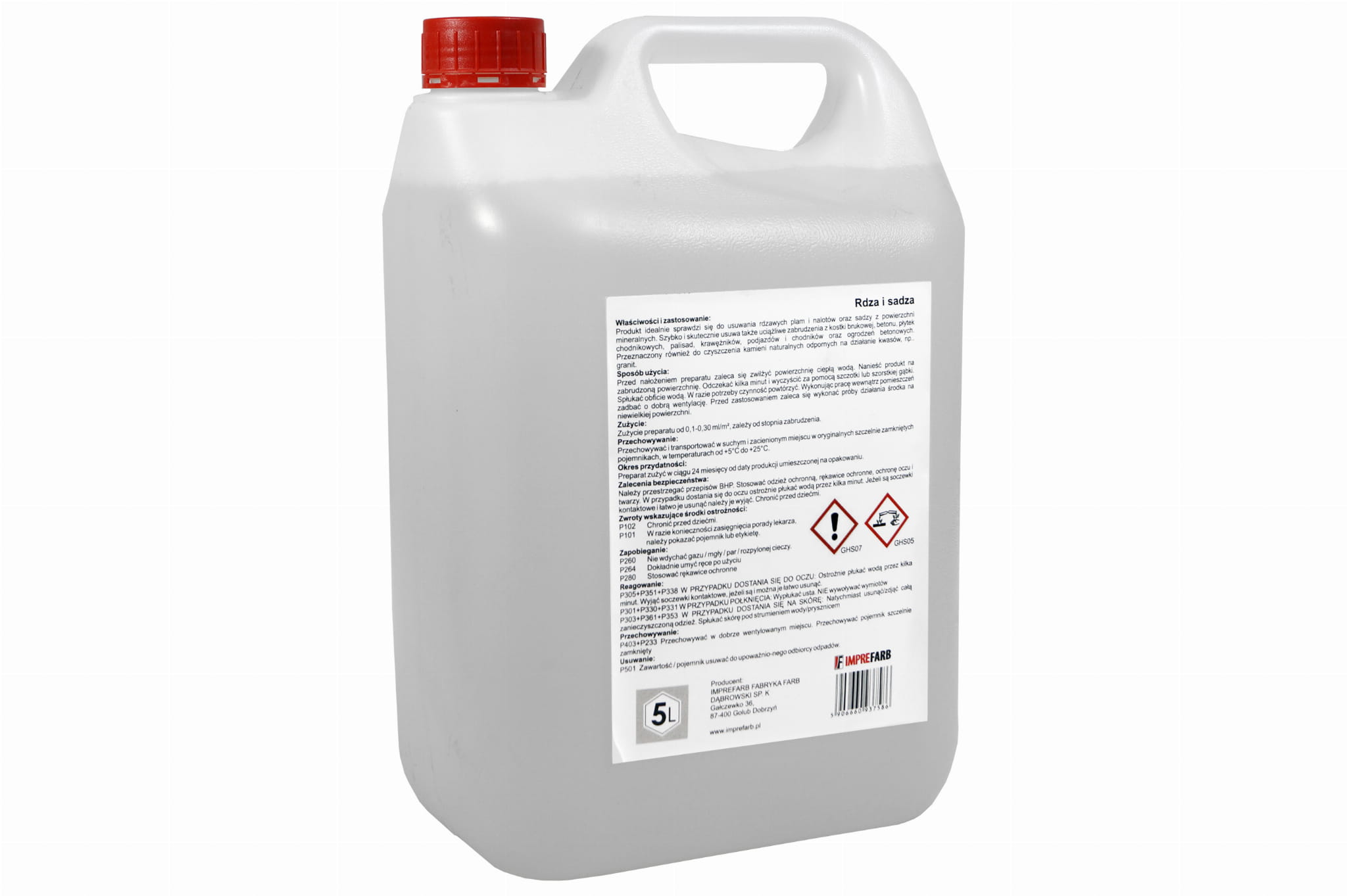 RDZA I SADZA 5L marki Imprefarb to specjalistyczny preparat do usuwania rdzy i sadzy z kostki brukowej, betonu, kamienia naturalnego (odpornego na kwasy np. GRANIT). Odnawia fakturę kamienia oraz nadaje powierzchni świeży wygląd.