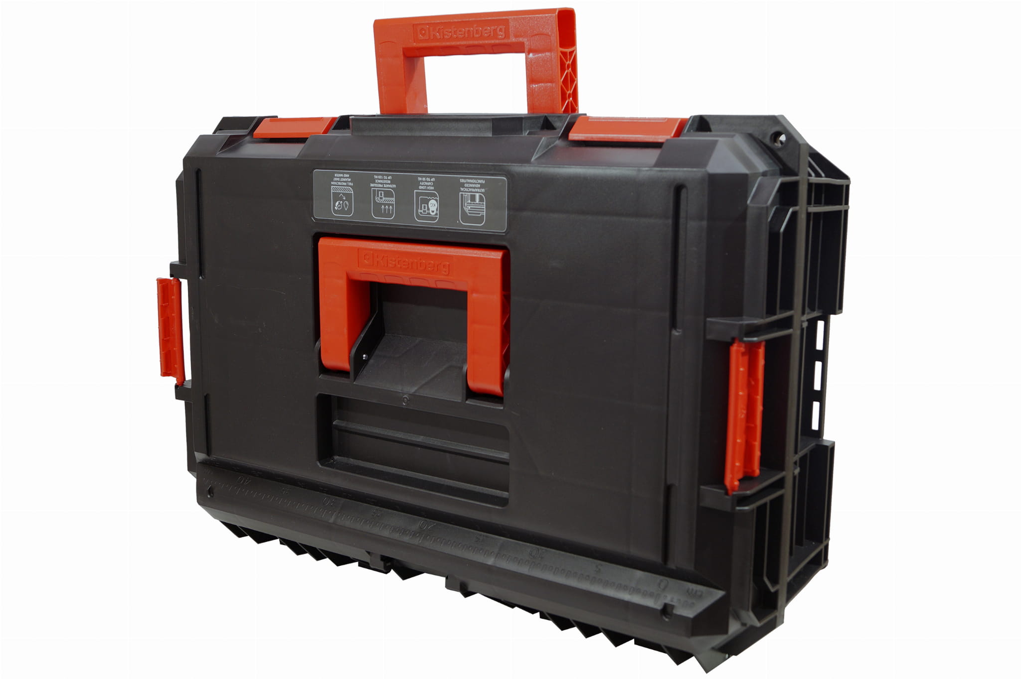 Skrzynka narzędziowa Kistenberg ma dwie rączki transportowe, które ułatwiają przenoszenie, zależnie od potrzeb (poziomo lub pionowo).