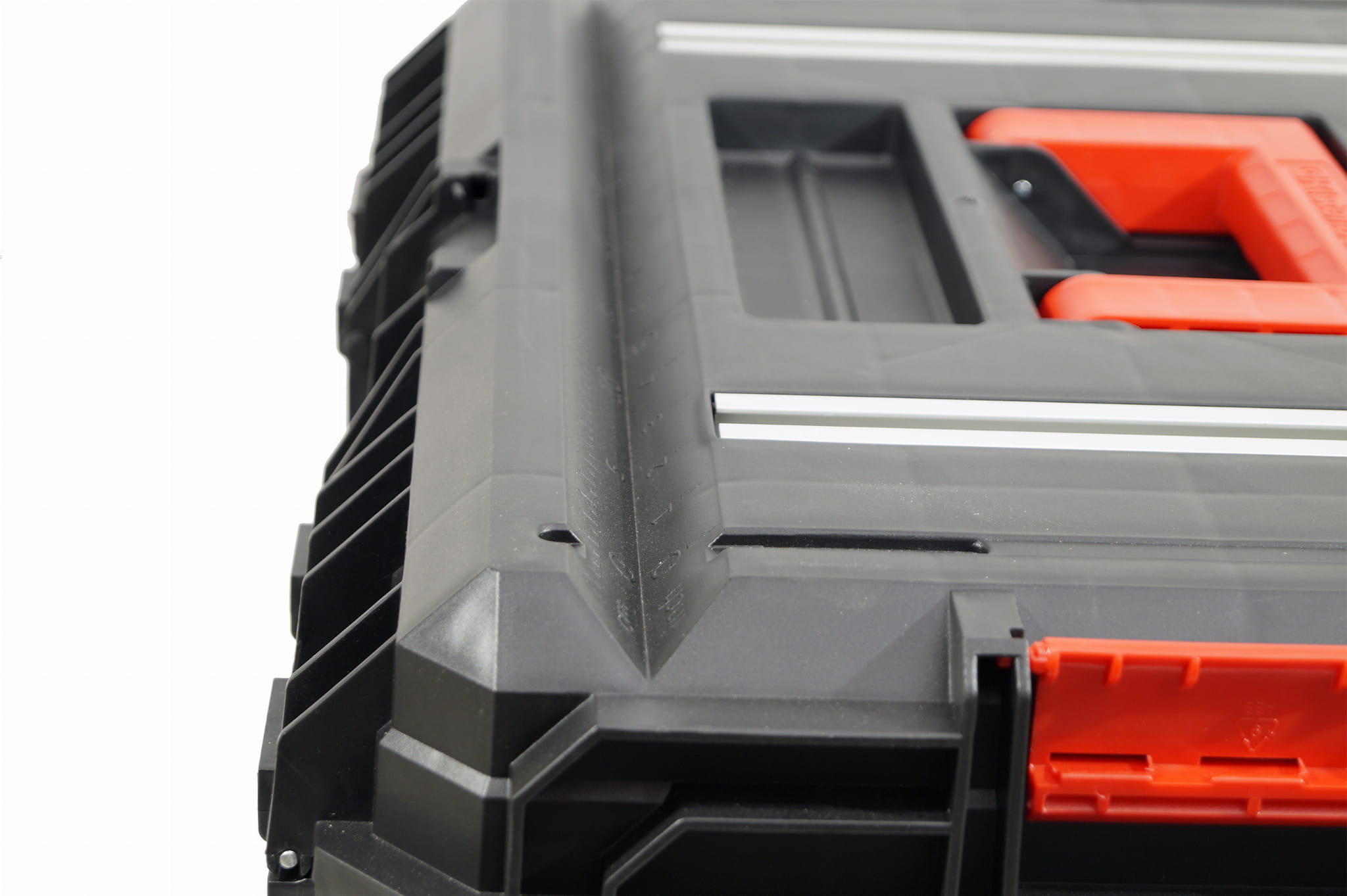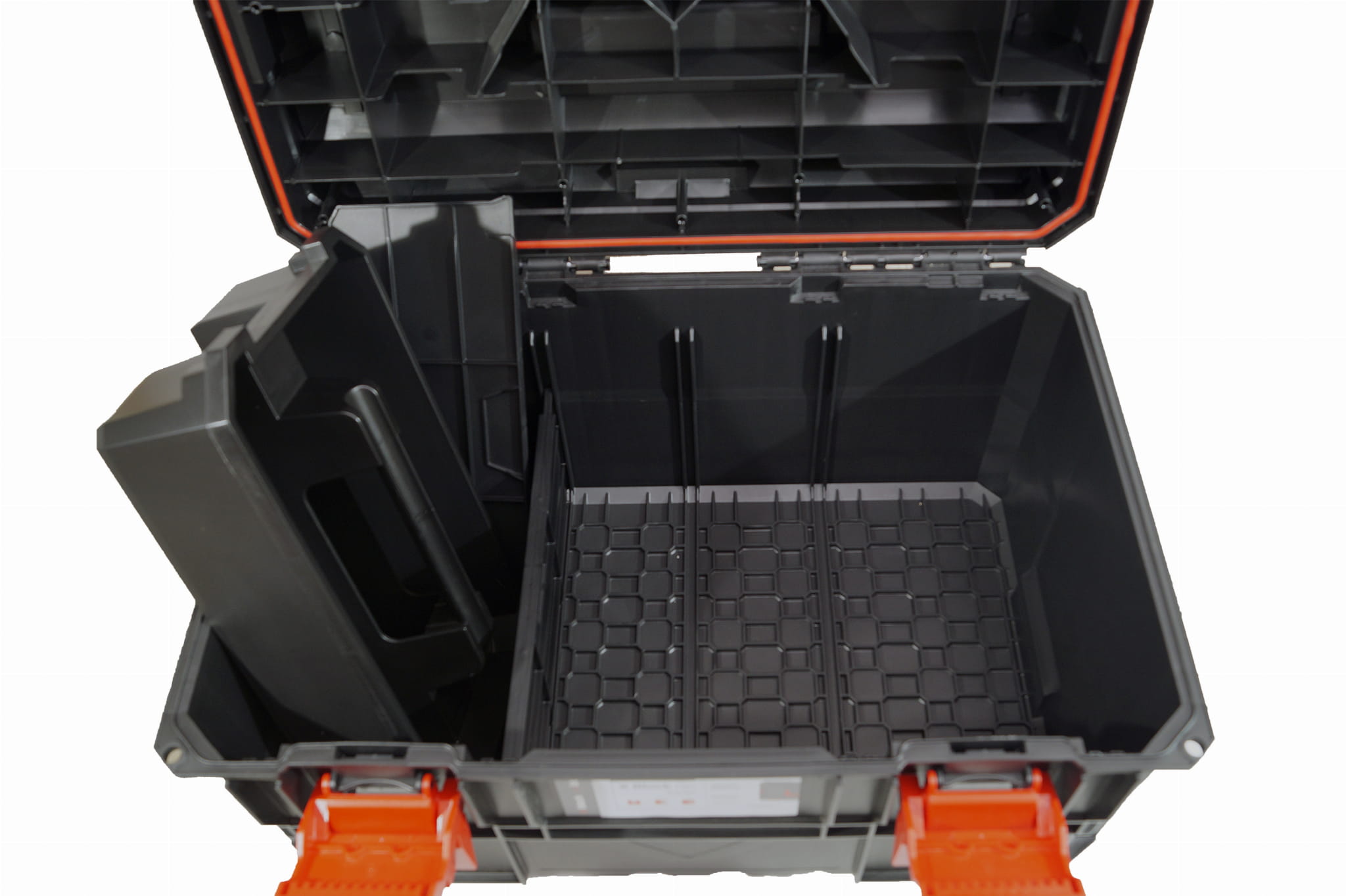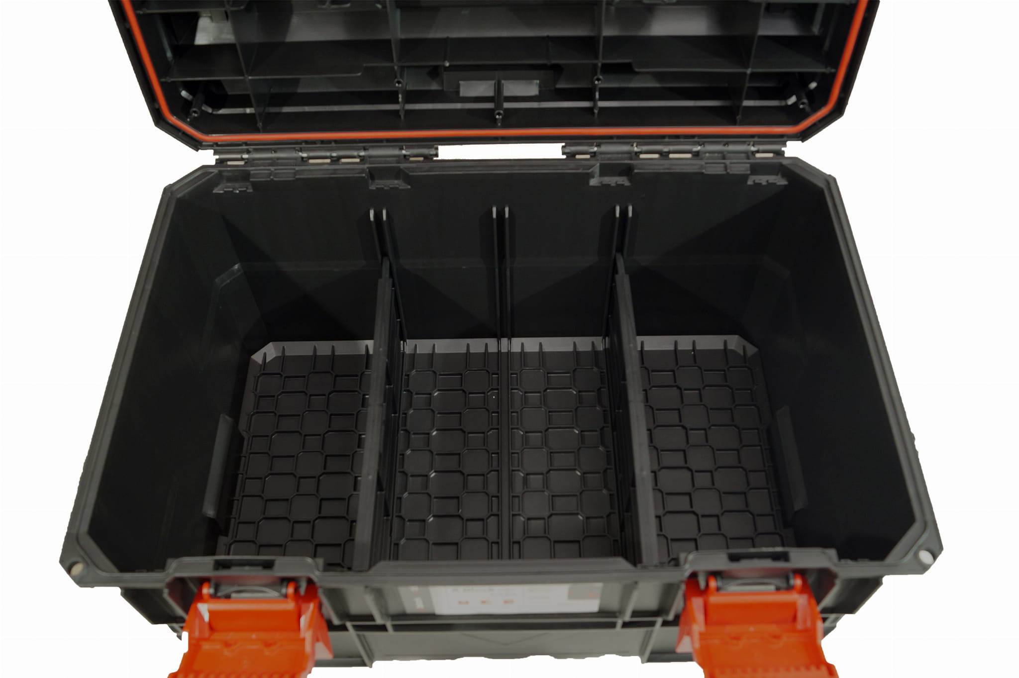 Skrzynka narzędziowa Kistenberg X-Block X TECH KXB604030G na pokrywie wyposażony został w szyny montażowe do ścisków stolarskich, a wewnątrz posiada 4 małe kuwety oraz 2 duże, jak również 2 przegrody.