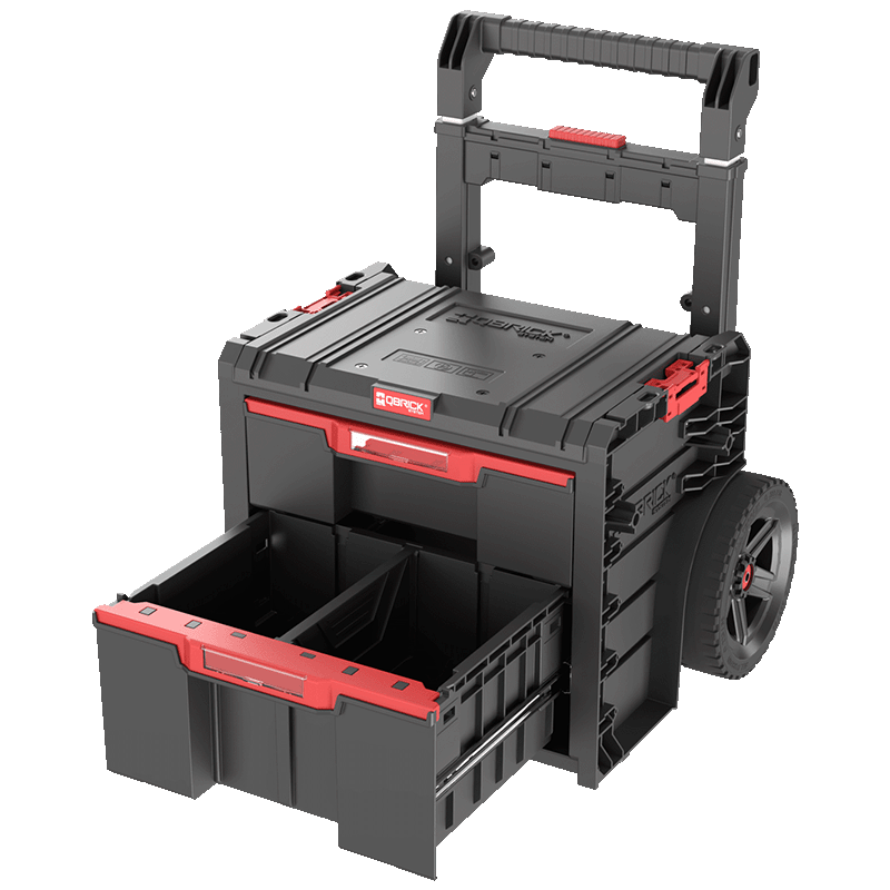 Qbrick System PRO Cart 2.0 Plus Drawer 2 to mobilne rozwiązanie, które łączy wygodę transportu z doskonałą organizacją narzędzi Skrzynia wyposażona jest w duże, 9-calowe koła pokryte grubą warstwą gumy, które gwarantują doskonałą trakcję, nawet w najtrudniejszych warunkach terenowych.